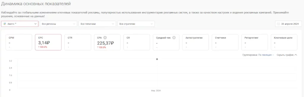 Чтобы проследить, как менялись цены на клики, мы покажем их 1 апреля 2023 года и 30 апреля 2024 года.