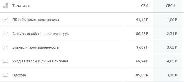 Дешевле всего было продвигаться в категории «ПК и электроника» (1,00 ₽). Здесь можно отметить вновь появившуюся тематику «Сельскохозяйственные культуры» (2,31 ₽), которую вы могли заметить среди «доступных» на других платформах.