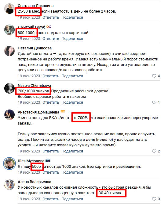 Здесь делать градацию по подрядчикам особо не имеет смысла. На бирже в основном заказы на статьи, посты видела редко и по каким-то смешным ценам 100 рублей за пост. Фрилансеры берут в среднем 500–1 000 рублей за 1 пост — в паблике по копирайтингу нашла занятное обсуждение: