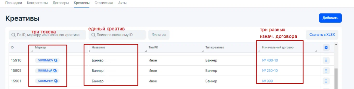 В итоге в блоке Креативы у РД будет три строчки: каждая строчка для своего токена, но с единым креативом для каждого erid.