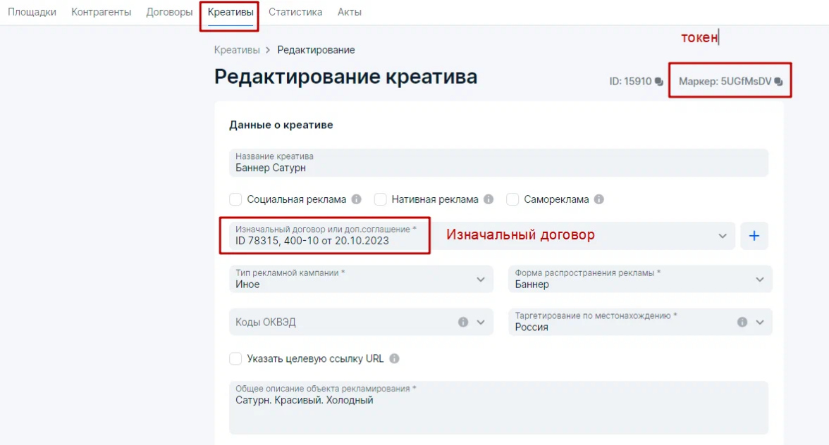 Прикреплением токена (креатива) к изначальному договору на примере ОРД ОЗОН