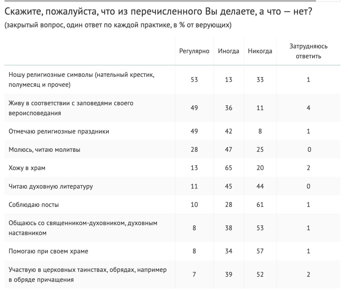 Очень интересны ответы верующих участников опроса ВЦИОМ на вопрос «Что из перечисленного вы делаете, а что — нет?». Сильнее всего проявляется религиозность россиян в дни религиозных праздников. 49% опрошенных отмечают их регулярно, 42% — иногда. О жизни в соответствии с заповедями своего вероисповедания также заявило подавляющее большинство, 49% выбрали вариант «регулярно», 36% — «иногда». Более половины опрошенных верующих (53%) регулярно носят религиозные символы (нательный крестик, полумесяц и прочее), еще 13% делают это иногда. Регулярно молятся 28% верующих респондентов, иногда — почти половина (47%). Регулярно ходят в храм 13% опрошенных верующих, иногда — две трети (65%). Число тех, кто иногда читает религиозную литературу и тех, кто этого никогда не делает, почти совпадает — соответственно 45% и 44%. Посты регулярно соблюдает каждый десятый (10%), никогда этого не делает большинство (61%). Более половины верующих никогда не общаются со священниками и духовными наставниками (53%), никогда не помогает при своем храме (57%) и никогда не участвует в церковных обрядах, таинствах (52%).