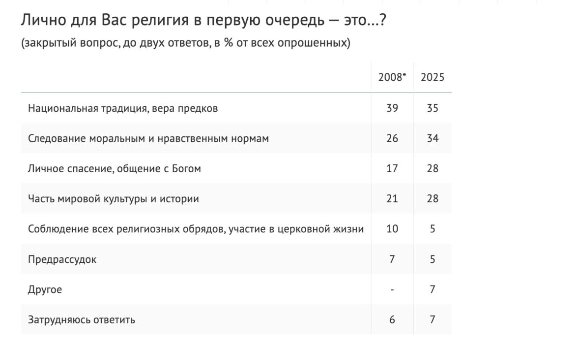Для подавляющего большинства россиян, называющих себя верующими, религия — это в первую очередь национальная традиция, вера предков, а также следование моральным и нравственным нормам. Такие ответ дали соответственно 35% и 34% участников опроса. О личном спасении и об отношении к религии как к части мировой культуры заявили по 28% опрошенных. Только каждый двадцатый (5%) поставил на первое место соблюдение обрядов. Такой же процент респондентов назвал религию предрассудком.