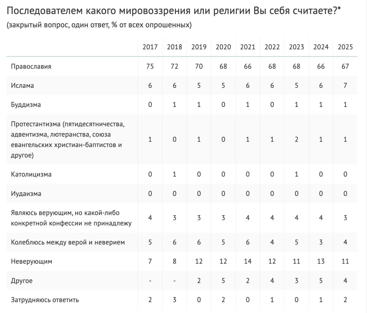 Две трети (67%) участников опроса ВЦИОМ заявили, что считают себя последователями православия. Начиная с 2020 года число респондентов, давших такой ответ, колеблется в интервале от 66% до 68%, что свидетельствует о стабилизации. В 2017 году православными называли себя три четверти (75%) россиян, показатель этого года ниже на 8 процентных пунктов. Число приверженцев ислама, буддизма, протестантизма в промежутке 2017–2015 годов остается примерно одинаковым, иудеи то ли не участвуют в опросах ВЦИОМ, то ли их доля среди респондентов ничтожно мала. Если сравнить, сколько атеистов было в России в 2017 году и сколько их в 2025 году, логично предположить, что часть православных разуверилась в религии. В опросе 2025 года о неверии заявили 11% респондентов — против 7% в 2017 году. Самое большое число неверующих было зафиксировано в 2021 году — 14%.