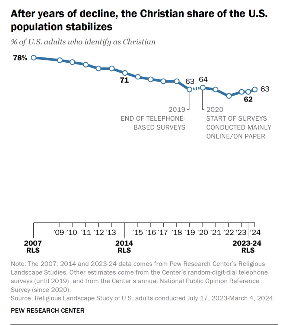 В 2007 году христианами называли себя 78% американцев. После этого каждый год число приверженцев христианской религии снижалось. В 2019 году наступила стабилизация, с того времени число американцев, называющих себя христианами, находится в промежутке 62–64%. По самым последним данным — 63%.