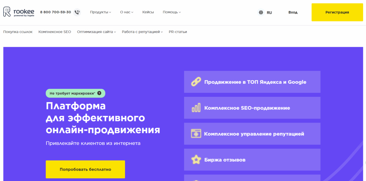 Rookee – это агрегатор ссылочных сервисов, на котором доступны сотни тысяч ресурсов и богатый арсенал инструментов: