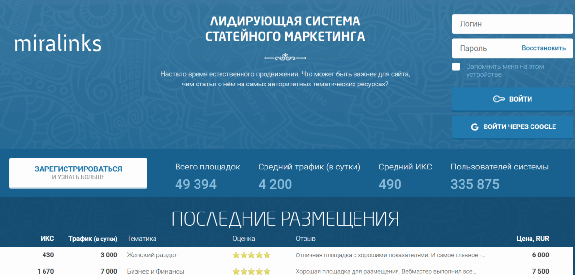 Miralinks – одна из наиболее популярных бирж статейного маркетинга. Она обеспечивает размещение линков внутри уникальных статей, которые публикуются на сторонних ресурсах. Биржа предлагает вечные ссылки. Они размещаются один раз и остаются в материале до тех пор, пока сам материал не удалят. Волноваться о качестве сайтов-доноров также не приходится. Miralinks предъявляет к ним строгие требования, а именно: