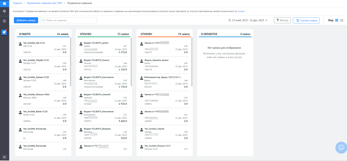 Стадии воронки мы можем настроить под себя, создав нужное количество. Процесс обработки классический. Каждая заявка-карточка имеет все необходимое: