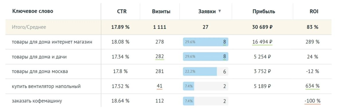 Рекламный канал Яндекс.Директ отражает точную статистику до ключевой фразы, показывает не только число посетителей, как метрика, но и число лидов (заявок).