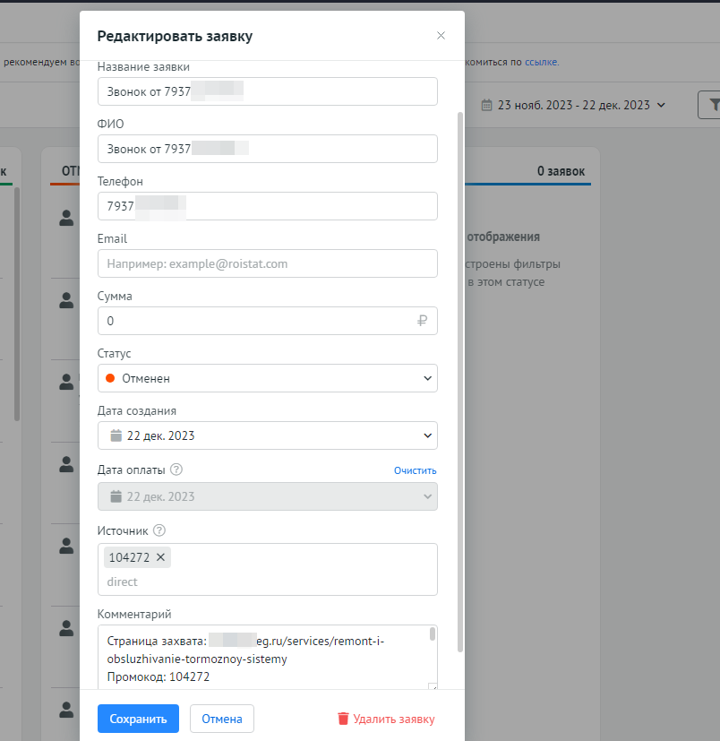 Roistat создает событие в виде лида, и мы абсолютно точно знаем кто это и откуда. В данном случае мы автоматически ставим статус «В работе», в поле «Телефон»