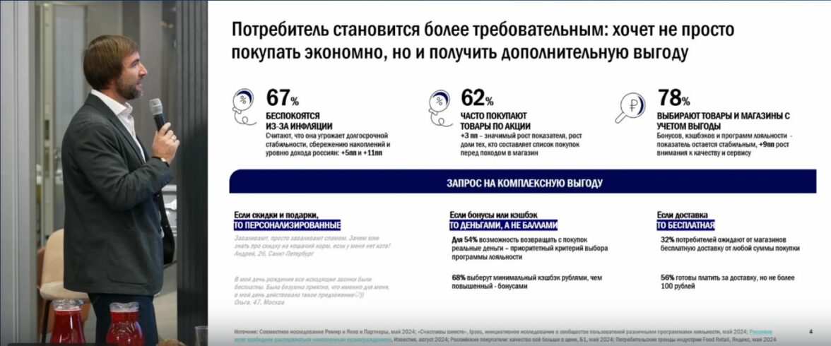Потребитель становится более требовательным и хочет покупать не просто экономно, но и получать дополнительные выгоды. 62% россиян часто покупают товары по акции, а 78% выбирают товары и магазины с учетом выгоды. В части дополнительных выгод они хотят видеть, персонализированные скидки и подарки, кэшбек не баллами и деньгами, а также бесплатную доставку в онлайн-магазинах.