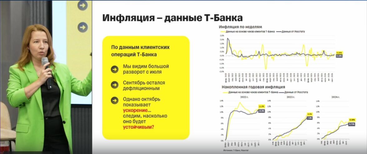 Среди основных причин инфляции в 2024 году Софья Донец выделила рост доходов и спроса населения. Курс рубля сейчас оказывает небольшое влияние на инфляцию, — сообщила она. По данным клиентов Т-Банка, пик инфляции в 2024 году пришелся на июль, после этого наблюдается процесс дефляции.