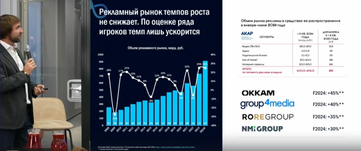 «Рекламный рынок растет высокими темпами, причем по оценке большинства игроков рынка темп только ускорится. Мы согласны с оценкой АКАР — 28% по итогам первого полугодия 2024 года относительно аналогичного периода 2023 года, однако считаем, что во втором полугодии будет замедление и по итогам года объем рекламного рынка вырастет на 25% без учета e-com», — сообщил на конференции «Медиаиндустрия сегодня и завтра: тренды в экономике, поведении потребителей и медиа 2024–2025» управляющий партнер рекламной группы SkyAlliance Василий Туровец.