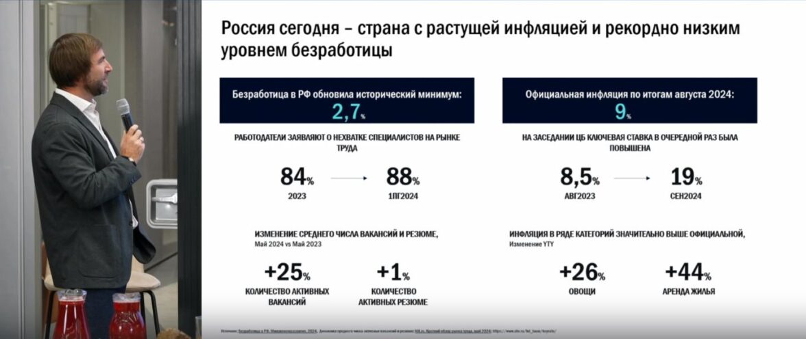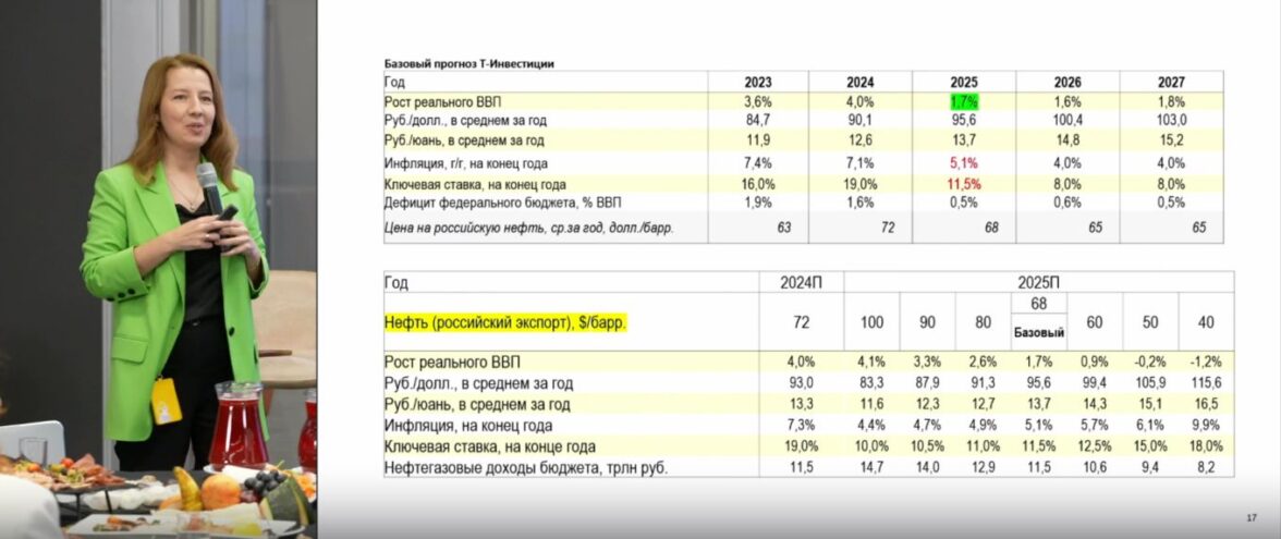 На конференции также присутствовал представитель одного из крупнейших рекламодателей, руководитель управления «Т-Банк Капитал» Софья Донец. Она поделилась прогнозом Т-Банка по росту реального ВВП, инфляции и ключевой ставке в 2025-2027 годах. Роста реального ВВП составит в 2025 году 1,7%, в 2026 — 1,6%, а в 2027 — 1,8%. Достигнув роста в 5,1% по итогам 2025 года, инфляция в 2026-м и 2027 годах снизится до 4%. Банк также ожидает снижения ключевой ставки: до 11,5% по итогам 2025-го, и до 8% в 2026-м и 2027-м.