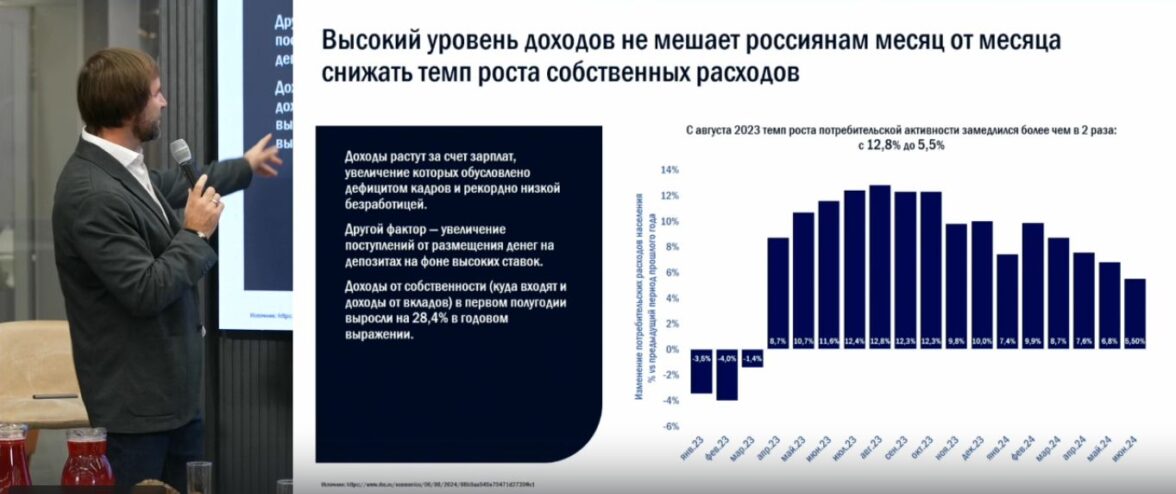 Россияне месяц к месяцу продолжают снижать расходы, несмотря на высокий уровень доходов. С августа 2023 года темп роста потребительской активности снизился более, чем в два раза: с 12,8% до 5,5% в августе 2024-го.