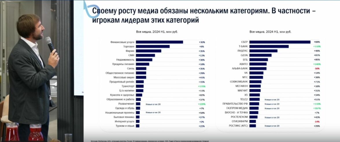 Среди крупнейших категорий рекламодателей он выделил финансовый сектор, ритейл (включая e-com) и фарму. Крупнейшие рекламодатели на российском рынке в первой половине 2024 года — «Сбер», Т-Банк, «Яндекс», Ozon и ВТБ.