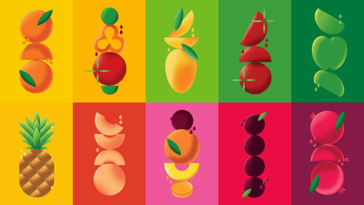 Яркие цвета фона и геометрические абстрактные фигуры фруктов передают гармоничный и насыщенный вкус напитков. Каждая иллюстрация совместно с фоном и шрифтовой частью формирует атмосферное восприятие у потребителя.