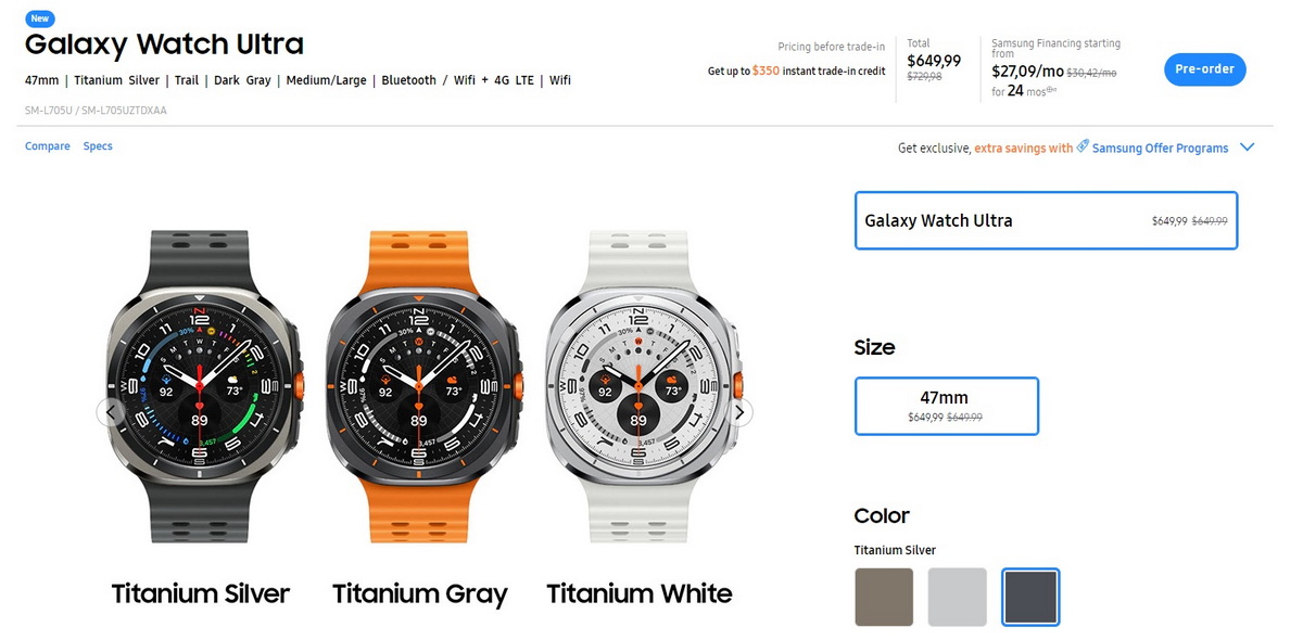 Galaxy Watch 7 будет стоить $299,99 (40-миллиметровый циферблат) и $329,99 (44-миллиметровый), за доступность диапазона 4G LTE нужно будет доплатить $50. Galaxy Watch Ultra – $649,99.