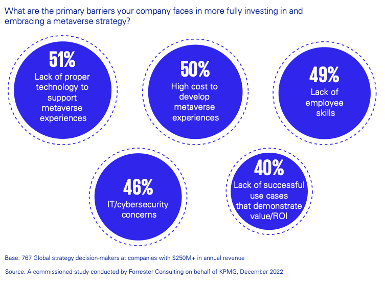 51% респондентов заявили, что для поддержки метавселенной не хватает надлежащих технологий, а 50% сказали, что высокая стоимость разработки метавселенной не позволяет их компаниям в полной мере инвестировать в стратегию развития этого направления. Еще около половины опрошенных (49%) отметили, что их компаниям не хватает специалистов для использования и развития метавселенной.