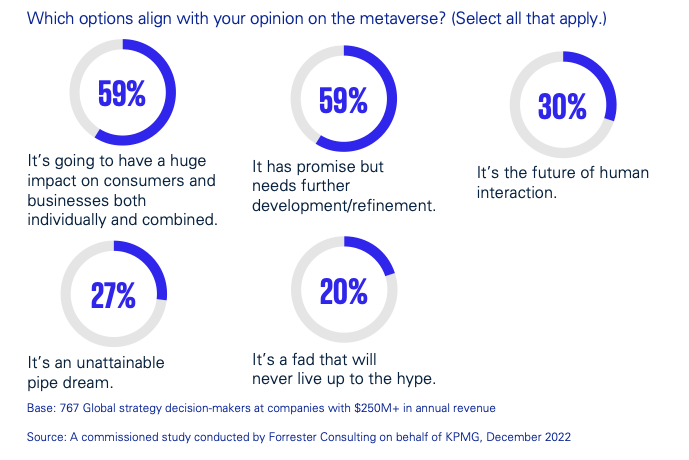 Шесть из десяти топ-менеджеров (59%), принявших участие в опросе, уверены, что метавселенная окажет огромное влияние на потребителей и бизнес. Но одновременно почти такое же количество руководителей TMT считают, что «метавселенная не станет процветающей коммерческой экосистемой через несколько лет». Они хотят увидеть доказательства более широкого использования метавселенных, прежде чем начинать инвестировать туда. 40% опрошенных не хватает успешных кейсов, демонстрирующих окупаемость инвестиций в виртуальность.