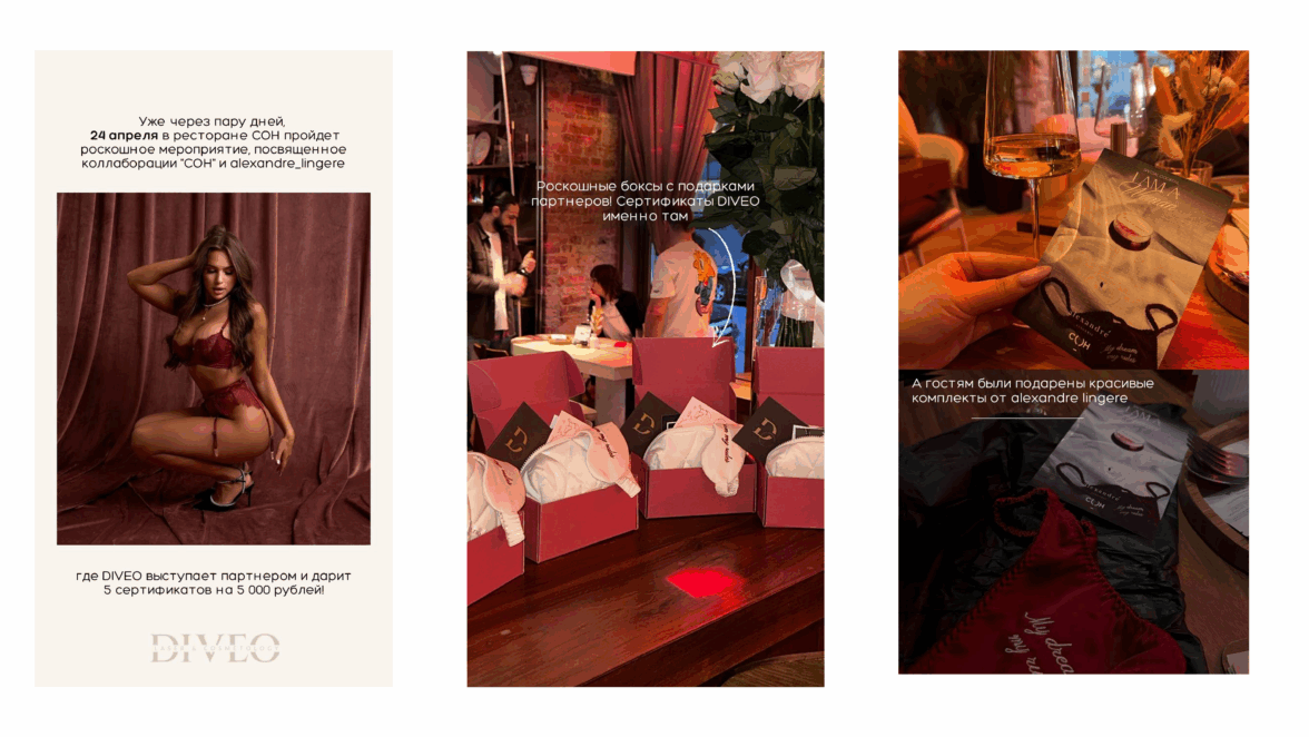 Чтобы получить дополнительный охват и UGC, мы провели офлайн-активацию — в формате светского мероприятия. Коллаборация: центр современной косметологии стал партнером ресторана «Сон» и бренда нижнего белья.