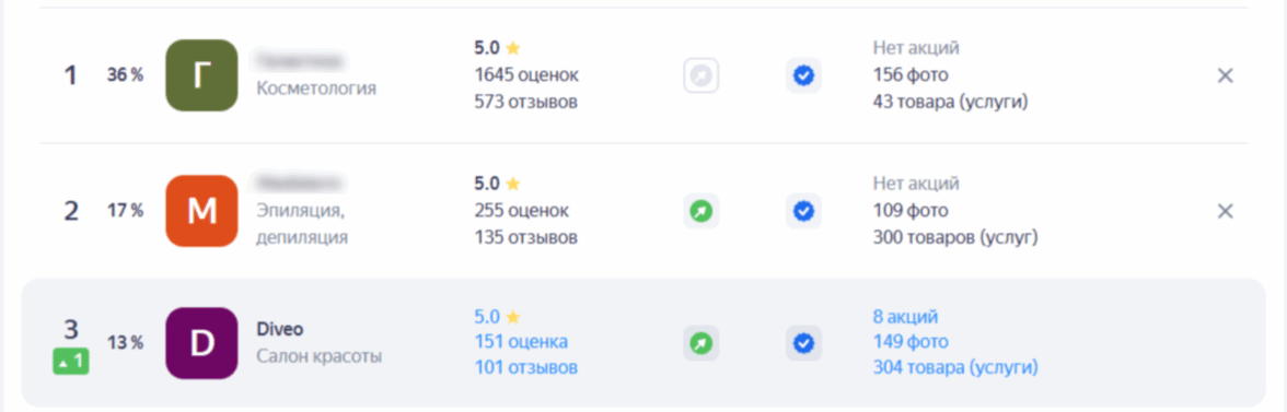 1. В апреле 2025 салон занял 4-е место среди конкурентов в категории «Косметология», и уже в мае был на 3 месте.