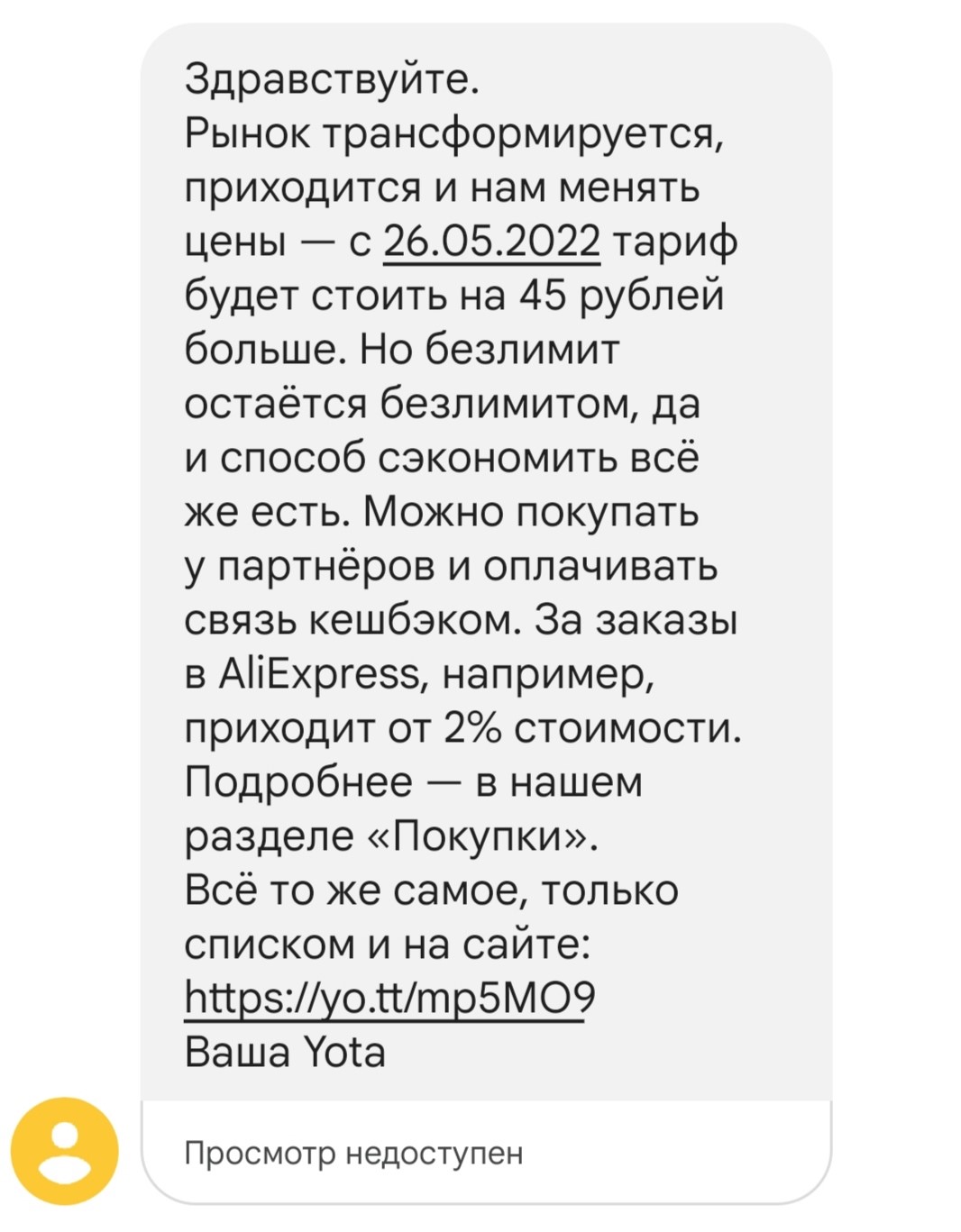 Информация об изменении тарифов. Компания обязана сообщить клиенту об изменении цены на свои услуги. Здесь, возможно, стоит пренебречь правилом краткости и объяснить причины, рассказать об оставшихся бонусах, как сделал мобильный оператор в примере.