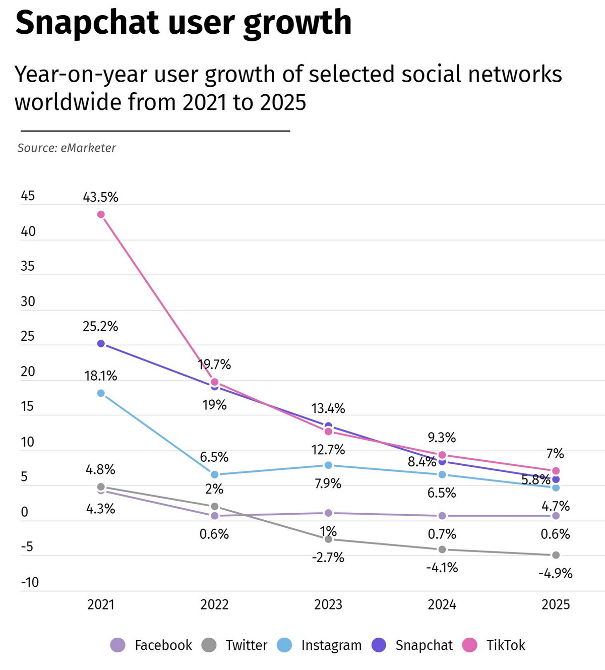 Snapchat значительно отстает от крупнейших в мире социальных сетей по количеству пользователей и доходам. Но за последние годы платформа показала впечатляющую динамику прироста пользователей. Число людей, использующих это приложение для обмена фотографиями и видео, с 2018 года удвоилось, опередив по темпам роста главных игроков соцсетевого рынка. Согласно прогнозу, представленному OnlyAccounts.io, Snapchat в 2023 году обгонит TikTok и станет самой быстрорастущей платформой соцмедиа с ростом числа пользователей на 13,4%.