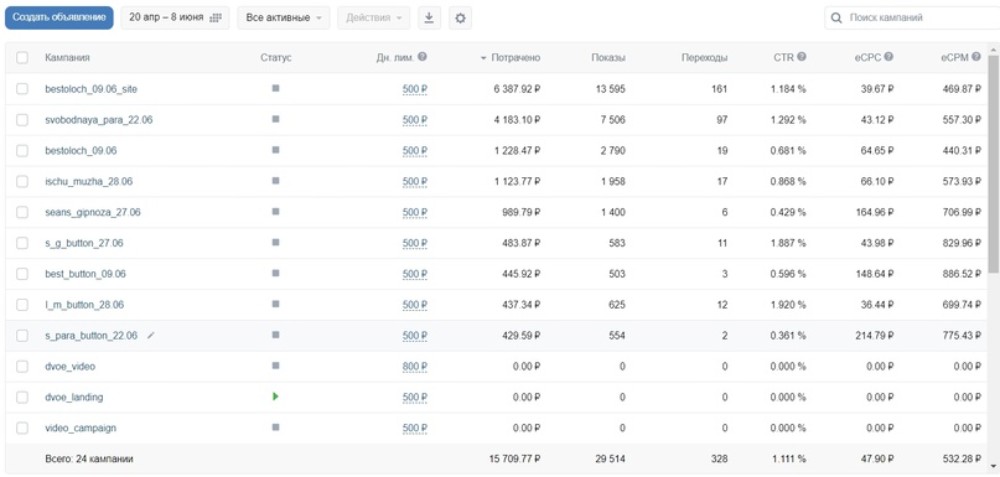 Ограниченный рекламный бюджет. Мы впервые запускали рекламу для этого клиента в кабинете PRO — у нас не было статистики, от которой можно было бы оттолкнуться. Мы проводили много тестов с аудиториями и таргетингами, и это тестирование осложнял скромный бюджет. В результате мы оставили наиболее эффективные кампании, остальные отключили. Не исключено, что с увеличенным бюджетом мы нащупали бы лучшую связку «креатив — аудитория — таргетинг».