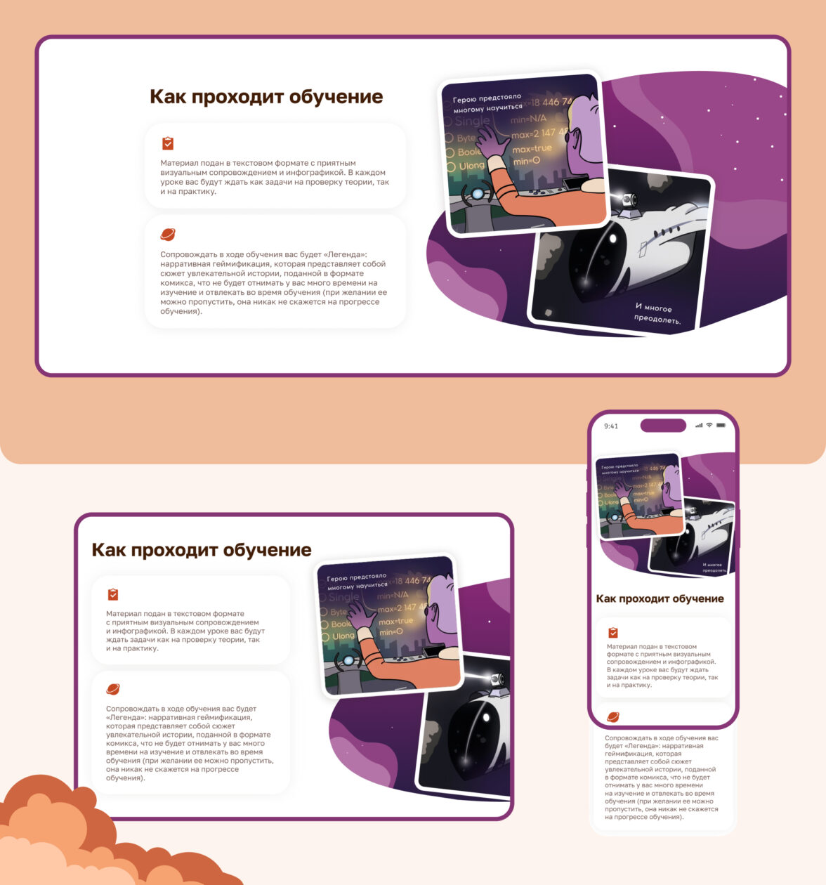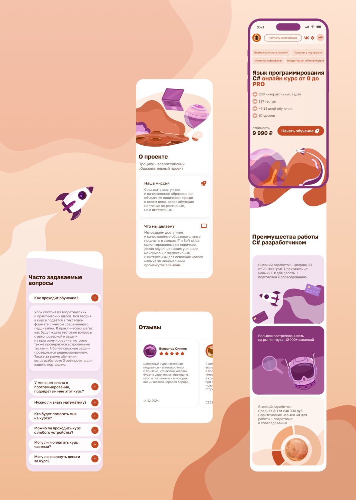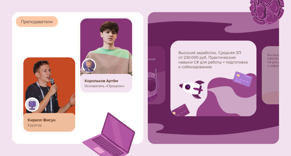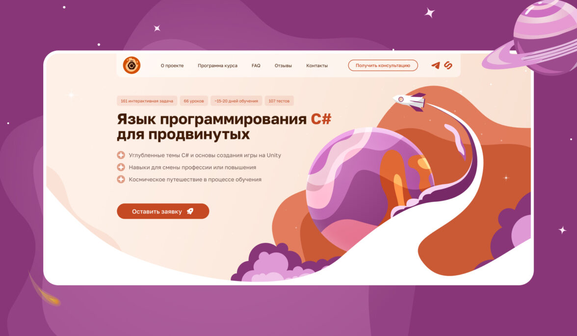 Команда завершила работу над лендингом примерно через 1,5 месяца после обращения. На выходе получилась посадочная, которая визуально совпадает с курсом: тот же комиксный космический язык, та же атмосфера, те же акценты на формате обучения.