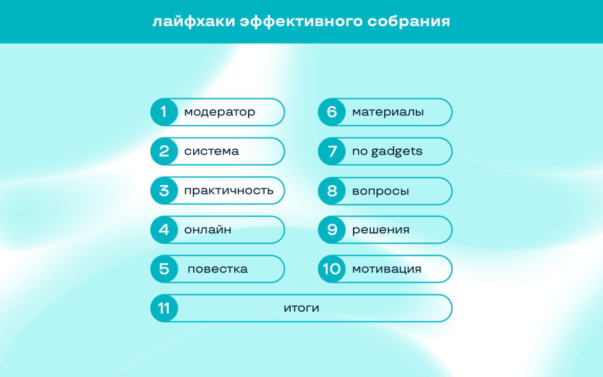 умения структурировать, ведь собрания предполагают обязательную подготовку;
