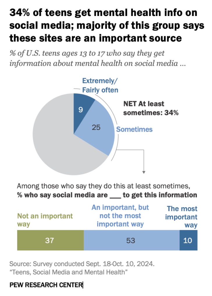 Информацию о ментальном здоровье сами подростки часто ищут в соцсетях. Часто или довольно часто таким образом поступает каждый одиннадцатый (9%) американский тинейджер. Каждый четвертый (25%) делает это периодически. Из тех подростков, которые используют соцсети для того, чтобы узнать об их влиянии на психическое здоровье, каждый десятый (10%) считает соцсети главным источником информации, а половина (53%) — важным, хоть и не самым важным.