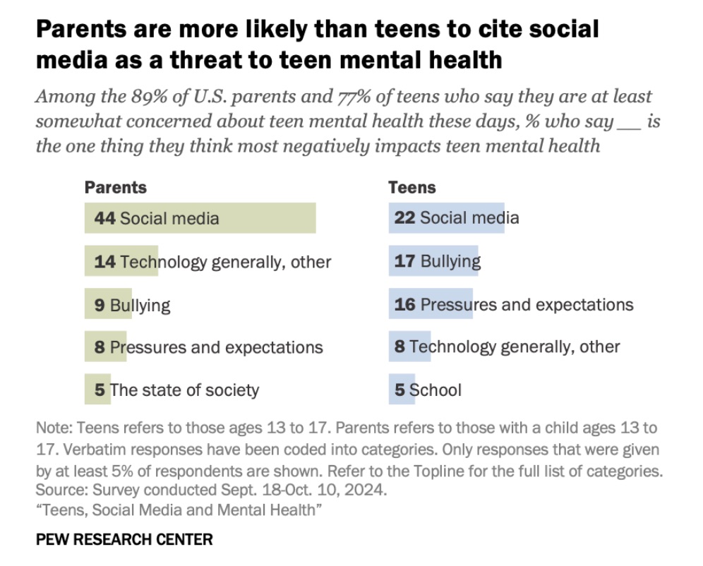 В негативное влияние соцсетей на подростков больше верят родители, чем дети. Почти половина родителей (44%) считают, что соцсети — главная угроза душевному здоровью подростков. Среди самих подростков такого мнения придерживаются лишь 22% опрошенных. На второе после соцсетей место по вредному влиянию на здоровье подростков родители ставят технологии в целом, а подростки — буллинг. При этом на пятое место по уровню вреда для душевного здоровья тинейджеры поставили школу, тогда как родители не включили ее в топ-5.