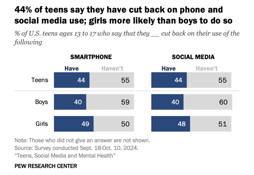 Число американских подростков, сокративших время использования смартфона (слева) и соцсетей (справа). Синий цвет — сократили, серый — нет. Сверху вниз: подростки, юноши, девушки.