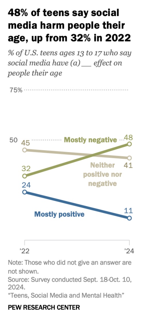 Платформы соцсетей на Западе все чаще сравниваю с табачными компаниями. Соцсети обвиняют во вредном влиянии на психическое здоровье подростков. Главный санврач США Вивек Мурти предлагал размещать в соцсетях предупреждающие надписи об их вреде для здоровья. Публикуется огромное число научных исследований и просто статей о возможном вредном влиянии соцсетей на душевное здоровье подростков.