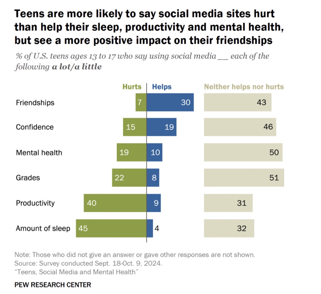 Мнение американских подростков о влиянии соцсетей на разные аспекты жизни. Салатовый цвет — вредит, синий — помогает, серый — не влияет. Сверху вниз: дружба, уверенность, душевное здоровье, оценки, работоспособность, продолжительность сна.