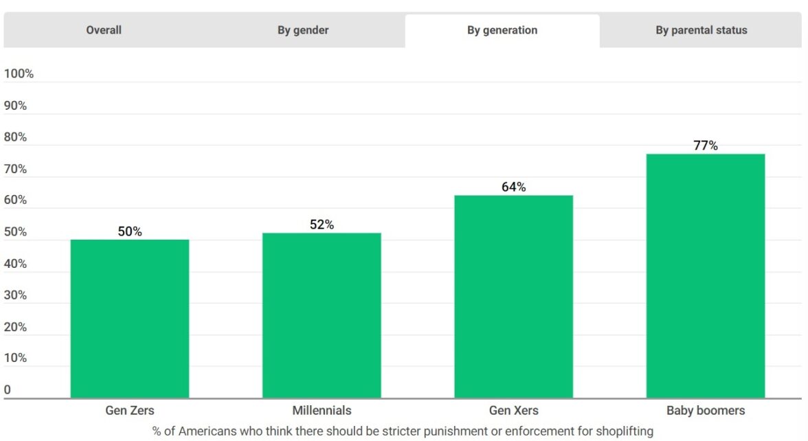 Чем старше человек, тем с большей вероятностью он является сторонником более строгих наказаний. Среди бэби-бумеров таких 77%, среди представителей поколения Х — 64%, среди миллениалов — 52%, а среди зумеров — 50%.