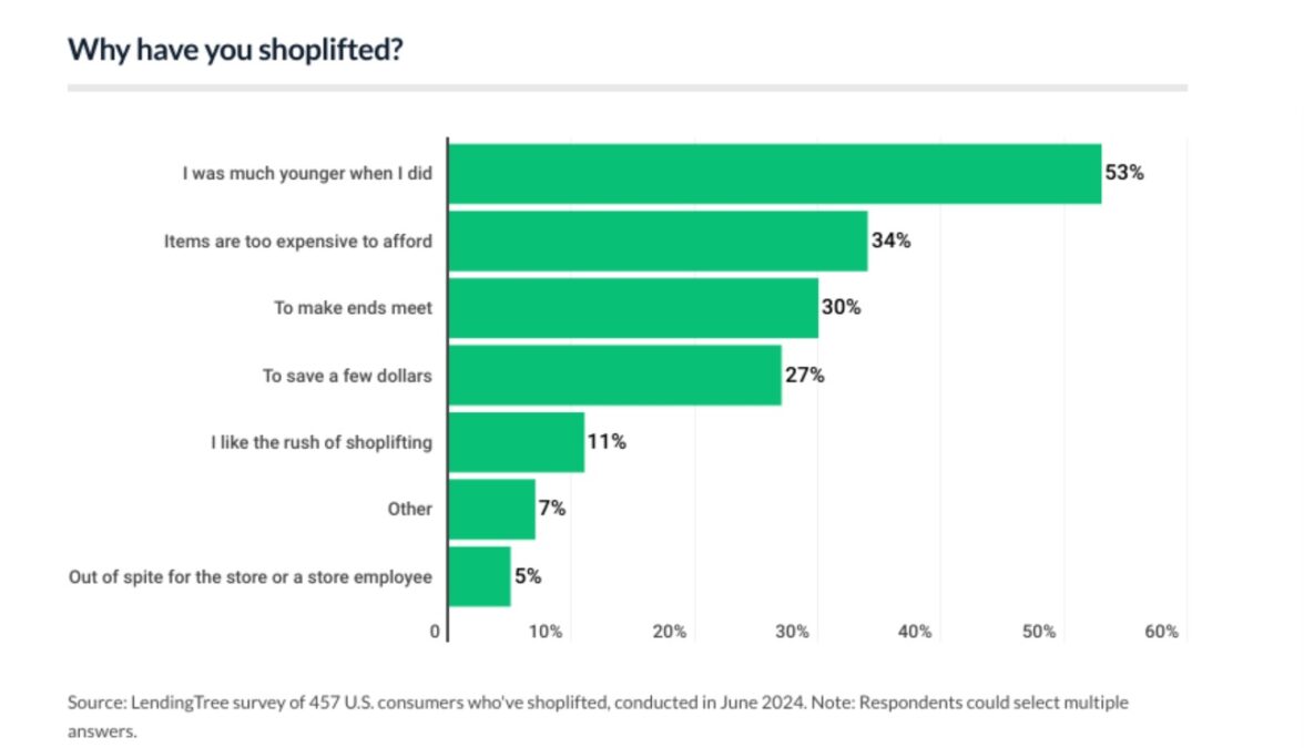 90% тех, кто недавно крал что-то из магазина, объясняют свой поступок инфляцией и ситуацией в экономике. Среди тех, кто когда-либо совершал магазинные кражи, ответы на вопрос «Зачем вы это делали?» (можно было дать несколько ответов) выглядят так: 53% — были молоды; 34% — цены стали недоступны; 30% — чтобы свести концы с концами; чтобы сэкономить пару баксов (27%); нравится возбуждение от шоплифтинга (11%); со злости на магазин или продавца (5%).