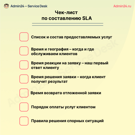 Мы подготовили удобный чек-лист по составлению соглашения об уровне сервиса. Мы включили в него 7 ключевых параметров, которые должны содержаться в SLA. Наличие этих параметров свидетельствует об установленных стандартах SLA для обслуживания клиентов.