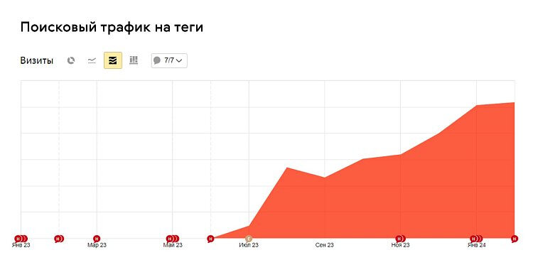 Маленький спойлер о том, как мы это сделали. Одна из доработок — внедрение системы тегов, чтобы сохранить трафик на категории, которые удалили при редизайне. На январь 2024 года теги привлекали порядка 20 % трафика в каталог.