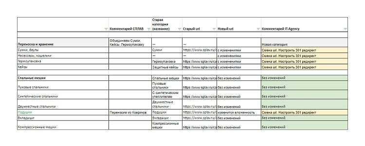 Так выглядел файл с планом действий по каждой странице. Например, команда «Сплав» отметила, что объединяет в одну категорию сумки, кейсы и гермоупаковку. Мы же для себя отметили, что по этим категориям нужно будет настроить 301 редирект