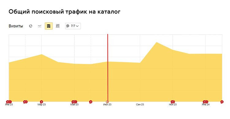 Если сравнивать январь 2023 с январём 2024 года, то общий поисковый трафик на весь каталог вырос на 23 %. А поисковый трафик на каталог «Туризм» вырос на 63 %.