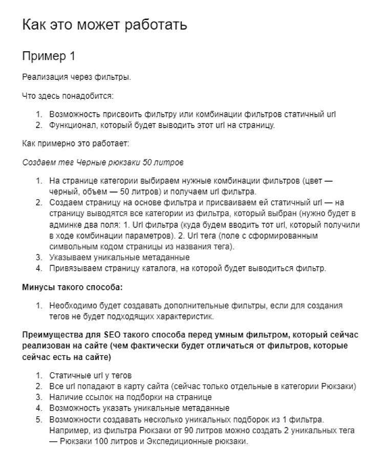 Тогда мы предложили внедрить систему тегов и выводить в них нужные категории. Фактически теги — это страницы со статичным URL, на которых собраны товары с определёнными характеристиками, как это было бы при использовании фильтрации.