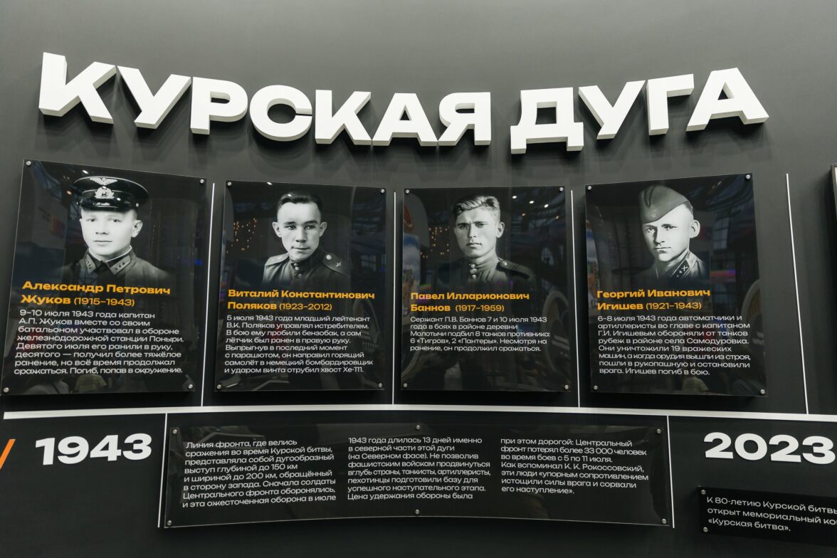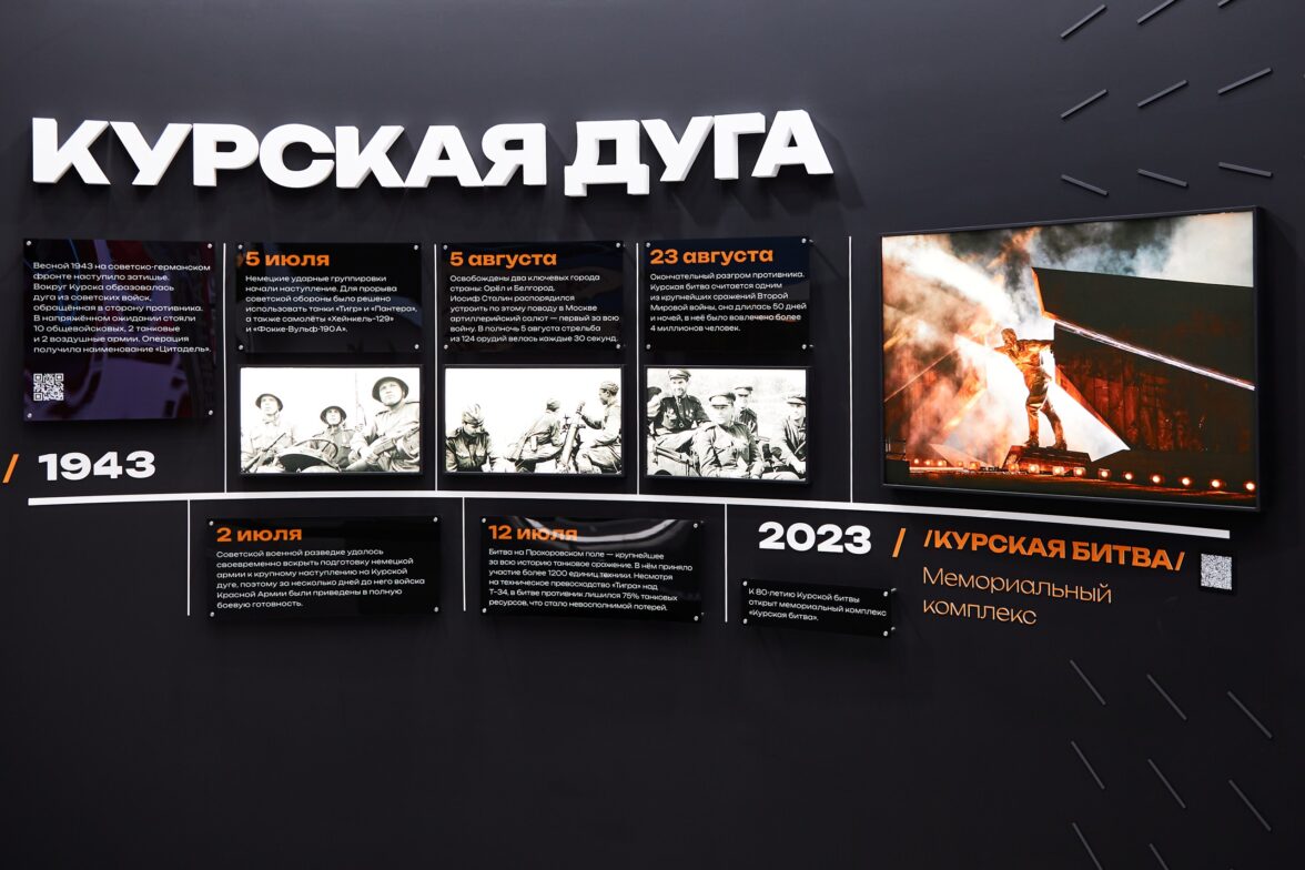 1. Историческая экспозиция, рассказывающая о Курской дуге. Гости могли узнать больше о событиях Курской битвы, которая длилась 50 дней и повернула ход Великой Отечественной войны. Последняя точка на таймлайне (23 августа 2023 года) повествовала о торжественном открытии мемориала «Курская битва» в Понырях, где 80 лет назад находился северный фас Курской дуги. Для разработки этого макета команда проекта привлекала специалистов исторического сообщества и Курского военно-исторического музея.