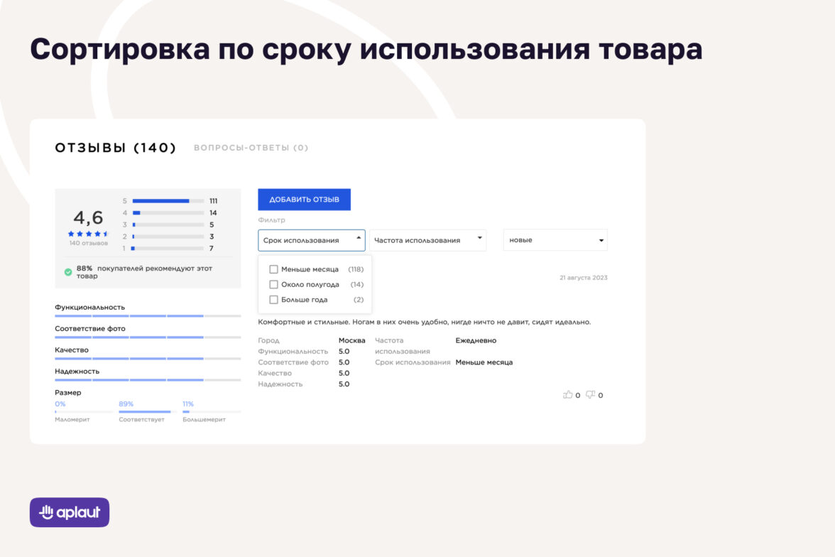 Справедливо и обратное: рейтинги с самыми старыми отзывами при отображении вверху страницы повышают конверсии на 134,4%. То есть пользователям важны недавние отзывы, но также интересен опыт покупателей, которые уже какое-то время пользуются товаром. Чтобы добиться положительных результатов, применяя этот параметр сортировки, важно соблюдать баланс между отзывами разной степени свежести.