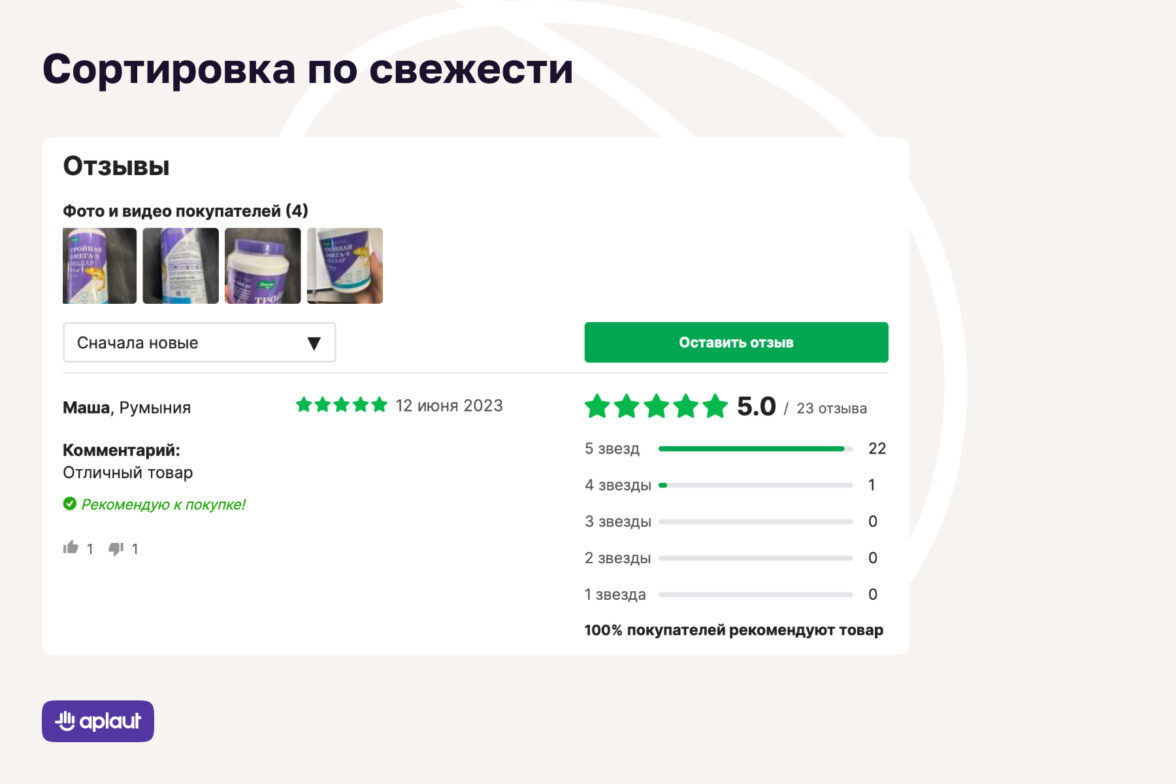 Использовать разные стратегии продвижения. Сортируйте отзывы по наивысшему рейтингу, по свежести. Соблюдайте баланс между платным и бесплатным продвижением ваших товаров. Органические отзывы важны не меньше, чем так называемый «спонсированный контент»: нативная реклама, промоутирование товаров, платные обзоры и т.д.
