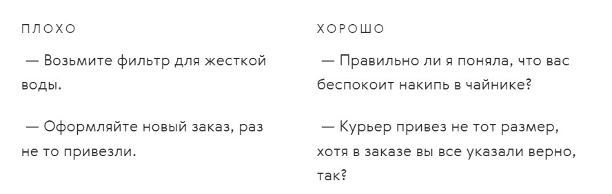 Если клиент говорит медленно, а вы — быстро, ему будет тяжело воспринимать информацию. Клиент будет всё время переспрашивать или, наоборот, постесняется задать лишний вопрос. В лучшем случае общение затянется, в худшем — клиент предпочтёт вежливо закончить разговор и уйдёт недовольным.