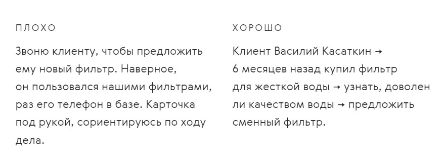 Для каждого клиента заводите собственную карточку в CRM. Отмечайте в ней, в чём была проблема, как её решили и что делать дальше. Карточка поможет другому оператору, если клиент позвонит во время вашего отпуска или болезни.