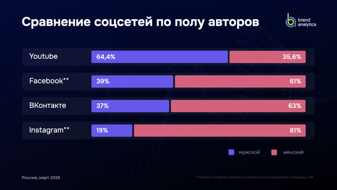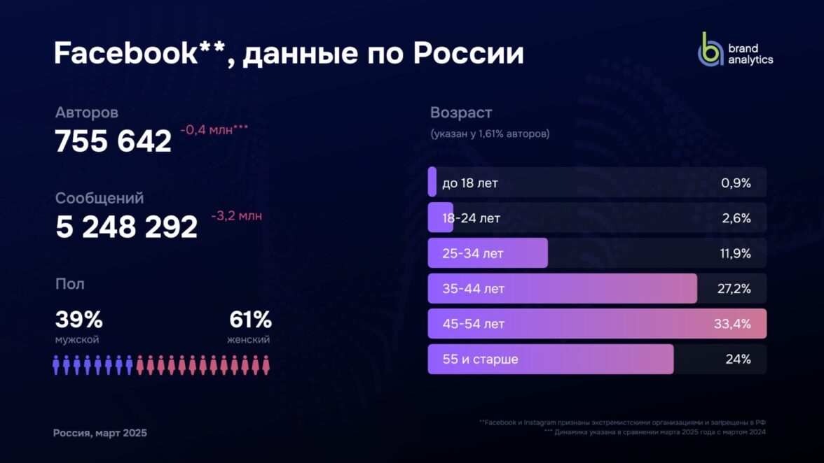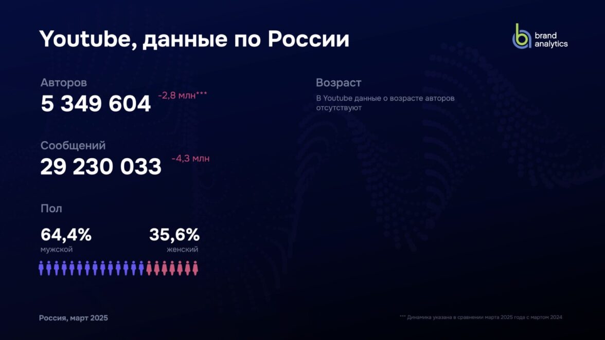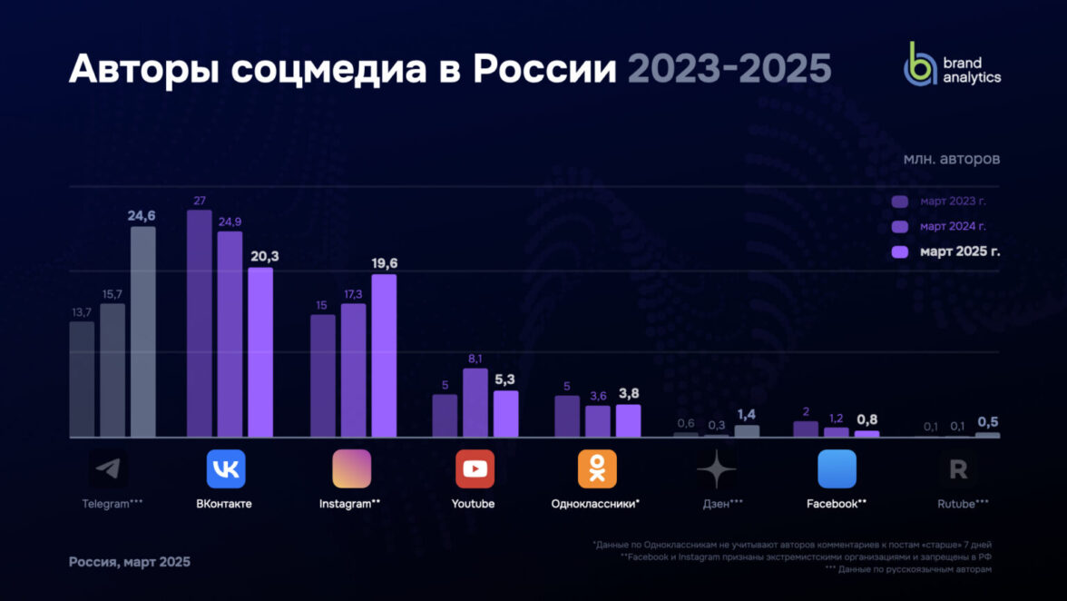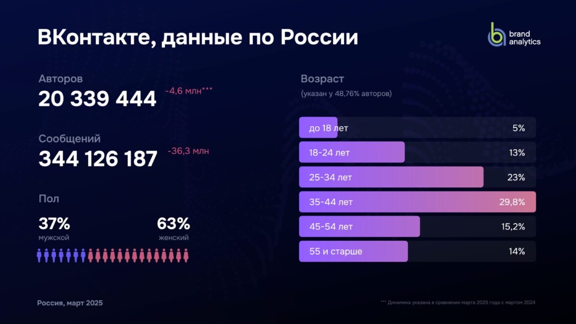Brand Analytics представляет данные традиционного ежегодного исследования активной аудитории (авторов) социальных сетей в России за март 2025 года. Внимание исследования сосредоточено на активной (пишущей) аудитории, поскольку мы изучаем социальные сети как средство публичной коммуникации и их влияние на формирование общественного мнения.