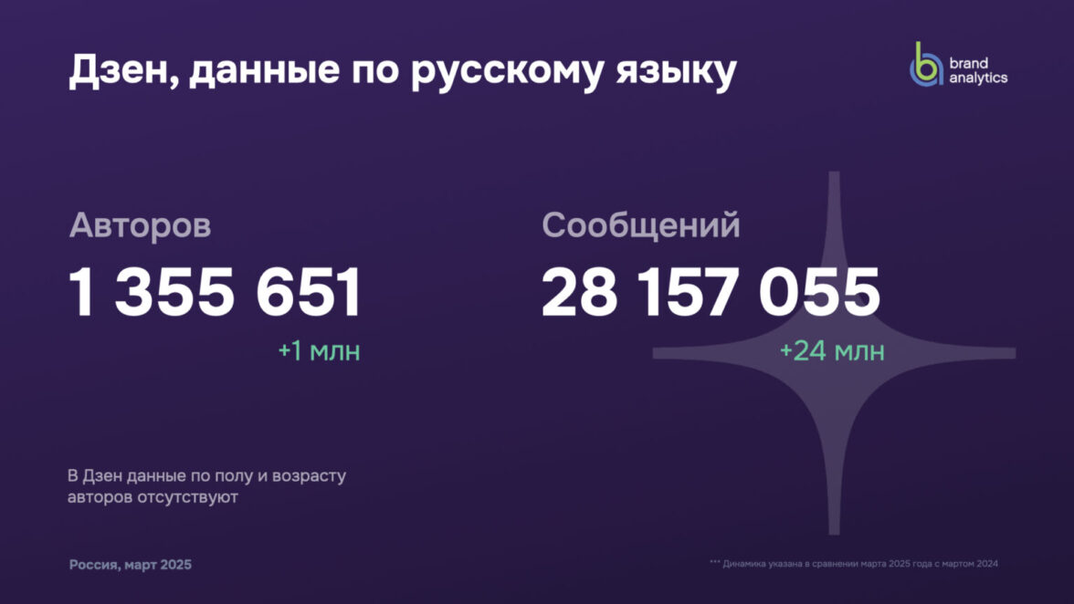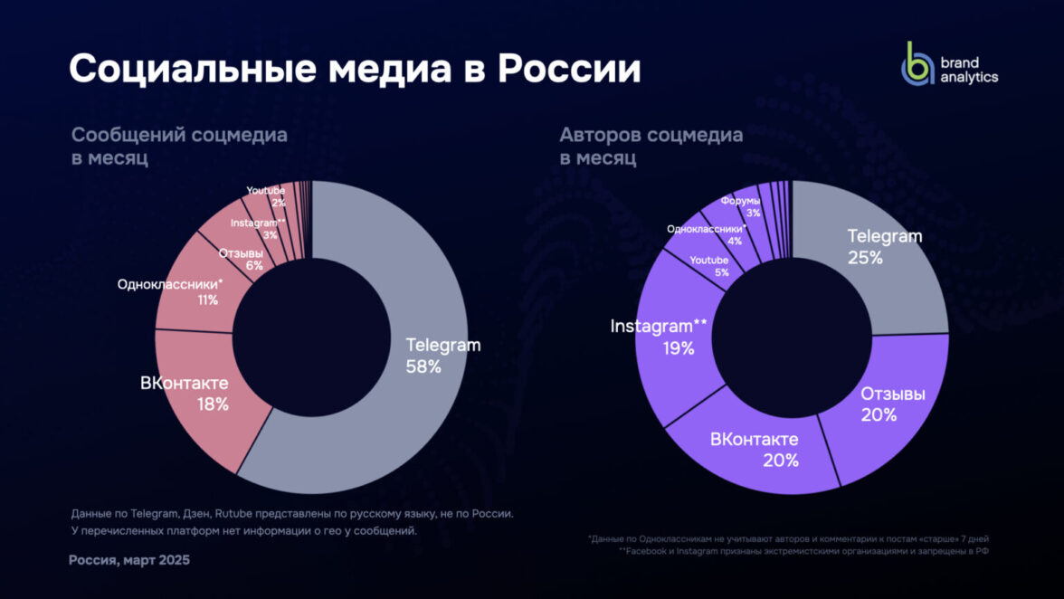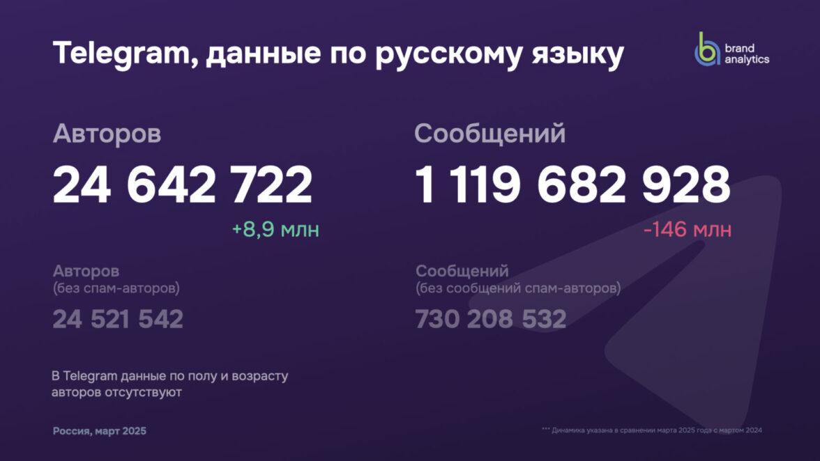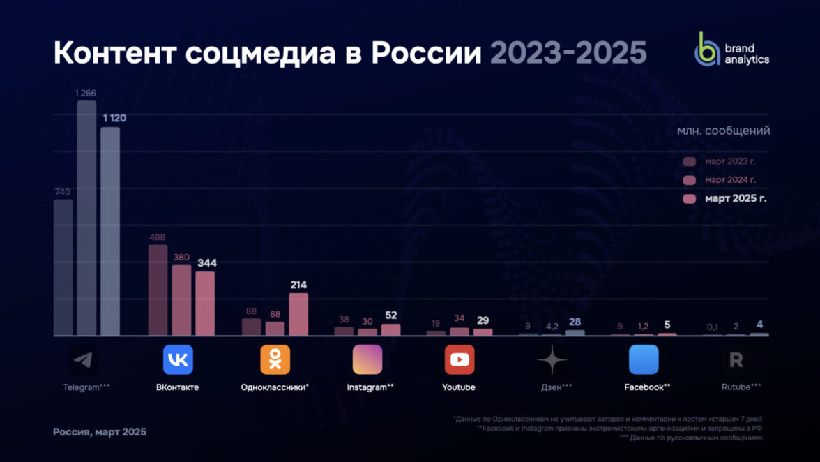 Brand Analytics собирает и индексирует все публичные сообщения социальных сетей на русском, татарском, украинском, казахском и некоторых других языках, а также данные их авторов. В рамках данного исследования были проанализированы более 3,24 млрд сообщений в соцмедиа за март 2025 года.